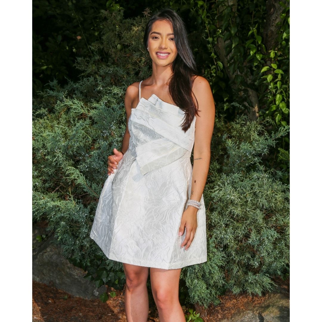 The “Flower Girl” dress exudes timeless elegance. Its design features a straight neckline that beautifully frames the collarbone. The structured bodice cinches at the waist, creating a flattering silhouette that gracefully flares into an A-line skirt. The fabric showcases an embossed or textured floral pattern, reminiscent of delicate blooms. Whether worn at a garden party or as chic bridesmaid attire, this crisp white dress captures the essence of natural beauty. For best care, please dry clean only. 🌸✨